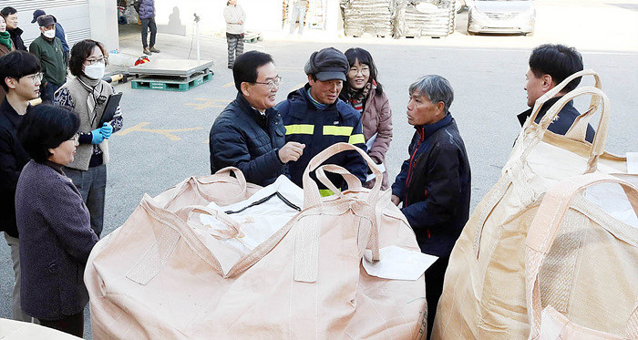 14일 광주 북구 북광주농협 우치점에서 열린 2023년산 추곡수매 공공비축미 매입 현장에서 문인 북구청장이 농협 관계자와 농민들을 격려하고 애로사항을 청취하고 있다.