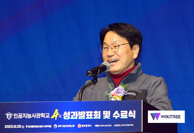강기정 광주광역시장이 5일 오후 서구 김대중컨벤션센터에서 열린 ‘광주인공지능사관학교 4기 성과공유회 및 수료식’에 참석해 축사를 하고 있다./광주광역시 제공