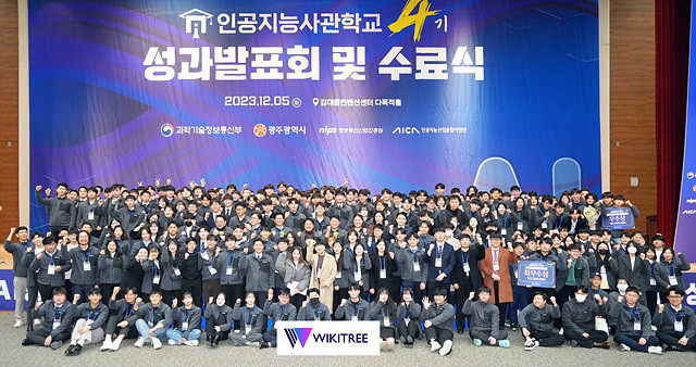 강기정 광주광역시장이 5일 오후 서구 김대중컨벤션센터에서 열린 ‘광주인공지능사관학교 4기 성과공유회 및 수료식’에 참석해 행사를 마친 뒤 교육생들과 기념촬영을 하고 있다./광주광역시 제공
