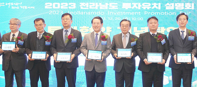 김영록 전남도지사가 20일 오전 그랜드하얏트 서울에서 열린 수도권 투자유치설명회에서 기업들과 투자협약을 체결한 후 기념촬영을 하고 있다.