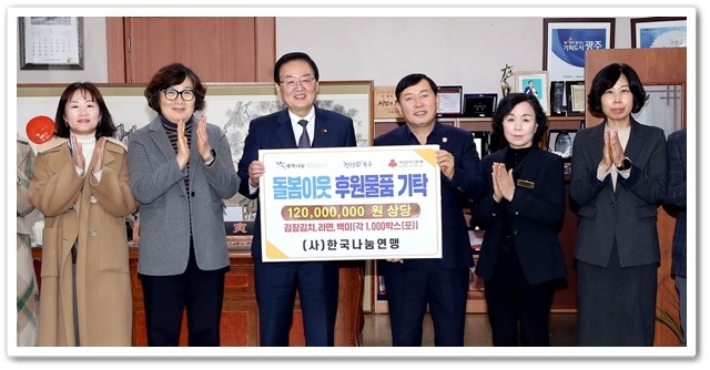 광주시 북구(청장 문인)는 11일 (사)한국나눔연맹(사무총장 안천웅·오른쪽 세번째)으로부터 새해를 맞아 지역 돌봄이웃들을 위한 1억2000만원 상당의 사랑의 후원품(백미10kg/1,000포,김장김치10㎏/1,000박스,라면40봉/1,000박스)을 기탁 받았다.
