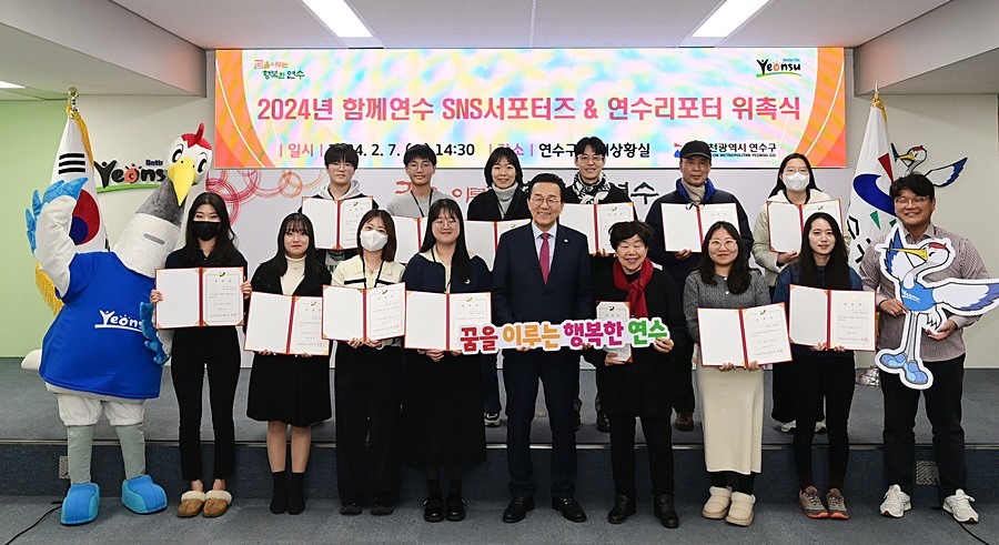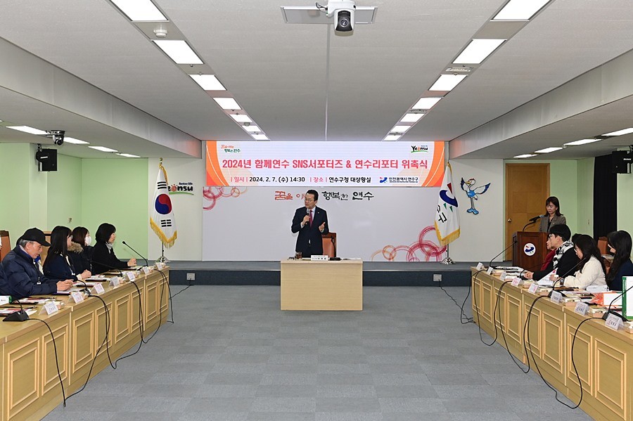 인천 연수구(구청장 이재호)는 지난 7일 구청 대상황실에서 구민 홍보대사의 역할을 수행할 ‘2024년 함께연수 SNS서포터즈 및 연수리포터 위촉식’을 개최했다.