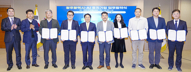 강기정 광주광역시장이 16일 오후 시청 비즈니스룸에서 인공지능 유치기업 7개사와 업무협약을 체결하고 있다./광주광역시 제공