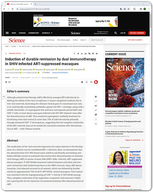 이 연구는 세계적인 과학저널 사이언스지 3월 호에 게재됐다.(기사 제목:Induction of durable remission by dual immunotherapy in SHIV-infected ART-suppressed macaques)
