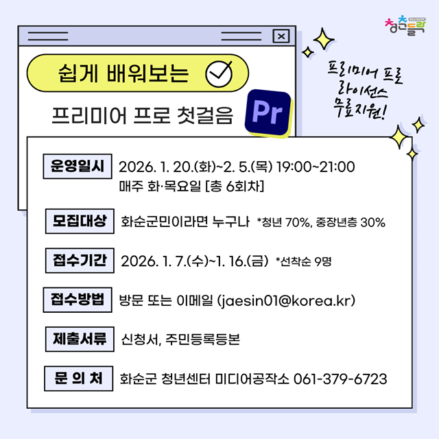 전남 화순군 미디어공작소, 영상 편집 초보도 전문가처럼! ‘프리미어 프로 첫걸음’ 교육 운영