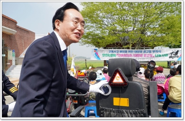 이날 행사를 통해 흥덕리 자미마을을 비롯한 25개 마을에서 사전수요조사를 통해 선정된 어르신 개개인의 전동의자차 100대에 태양광 경고등이 부착됐다.