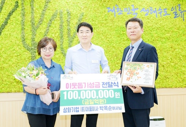 순천시(시장 노관규)는 18일 삼화기업 前대표이사 박옥순 여사께서 1억 원을 이웃돕기성금으로 순천시에 온기나눔했다고 밝혔다.