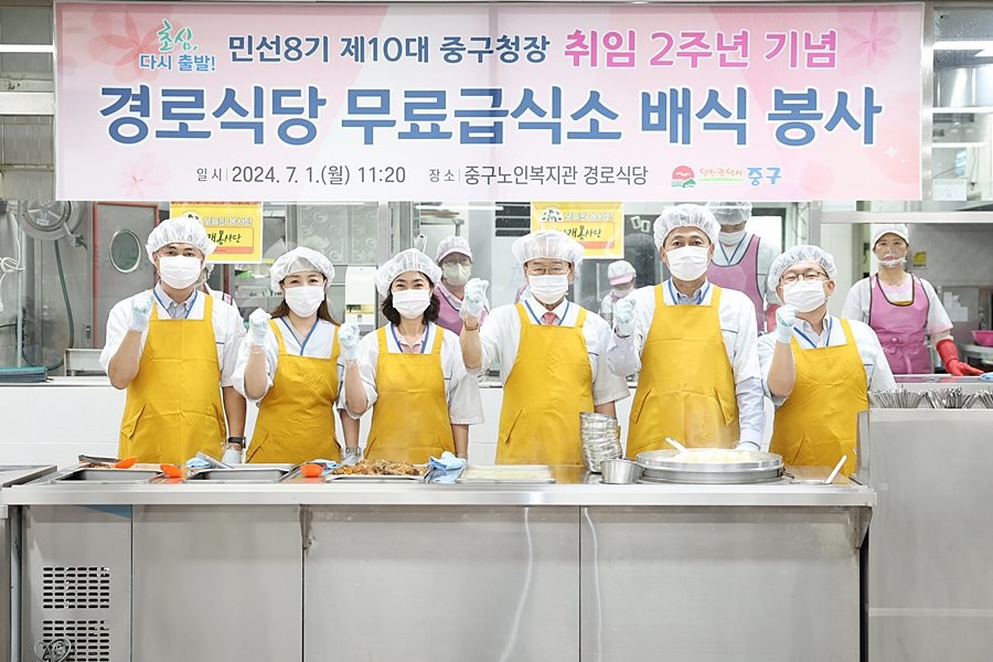 김정헌 인천 중구청장이 취임 2주년을 맞이해 더 낮은 자세로 민생을 살피고자 지난 1일 중구노인복지관 경로식당에서 ‘무료급식소 배식 봉사’를 진행했다.