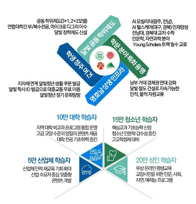 전남대는 최근 글로컬대학 혁신 실천과제로 경북대와 ‘달빛동맹 연합대학 공동학위 운영’을 제시했다. 남부거대경제권의 중심에 있는 광주광역시와 대구광역시 간 달빛동맹 강화와 상호교류 활성화에 기여하면서, 이를 토대로 향후 거점국립대 간 연합체계의 모델 개발로 확장시켜 나가겠다는 구상이다.