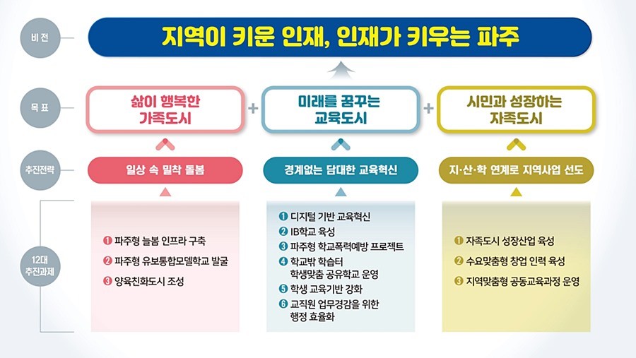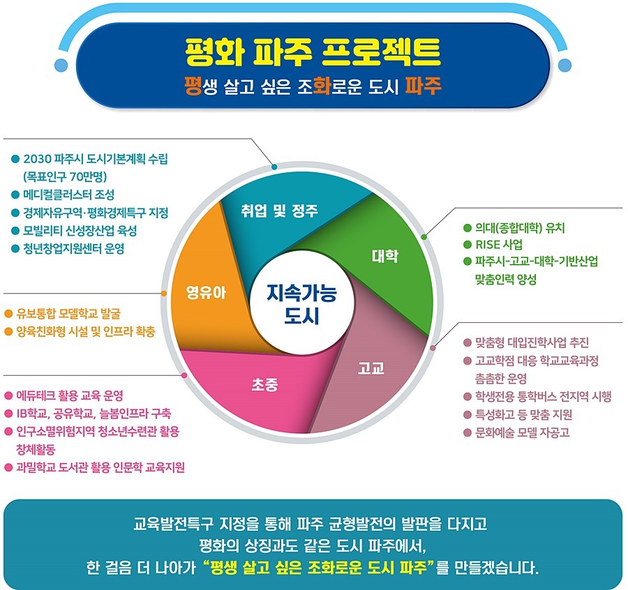 파주시가 ‘평생 살고 싶은 조화로운 파주, 평화파주 프로젝트’를 모토로 내놓은 파주형 교육발전 모델은 ▴일상 속 밀착 돌봄으로 삶이 행복한 가족도시 ▴경계없는 담대한 교육혁신으로 미래를 꿈꾸는 교육도시 ▴지-산-학 연계로 지역사업을 선도하여 시민과 성장하는 자족도시 등 크게 3가지 목표로 추진된다.
